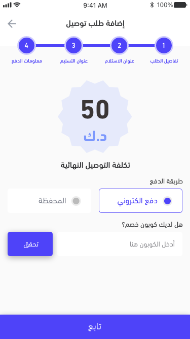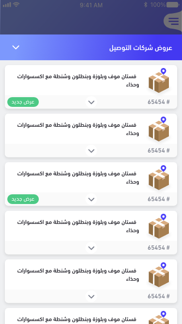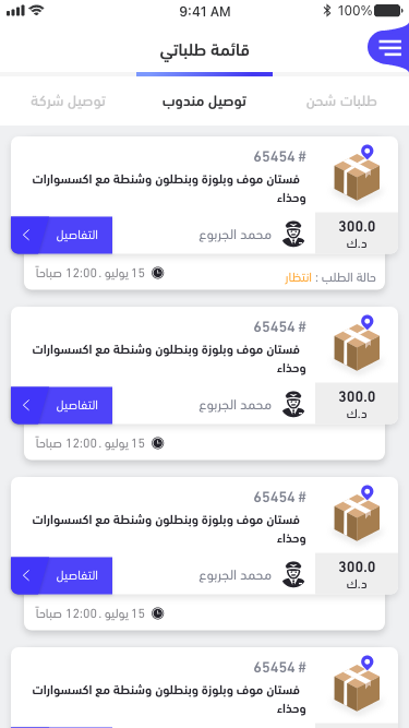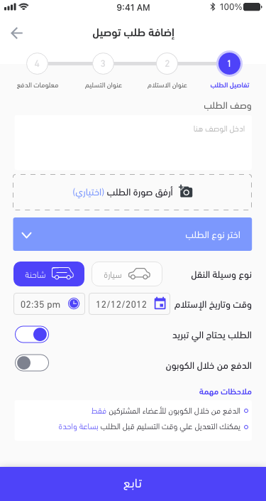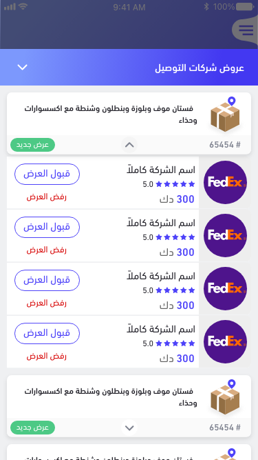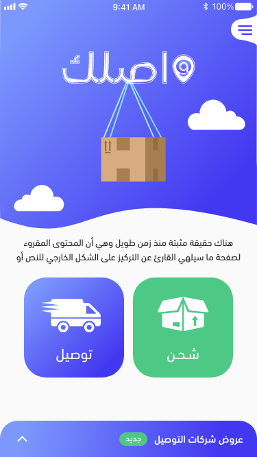 • خيارات متعددة: يتيح التطبيق للمستخدمين اختيار نوع الخدمة التي يحتاجونها، سواء كانت توصيل سريع، شحن عادي، أو خدمات خاصة.